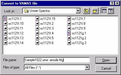 Figure 1: Convert to VAMAS file dialog window. Note the .unw extension used to indicate that the set of files contain spectra acquired using Ron Unwin's data system. The –anode Mg is only used to force the X-ray source to be Magnesium instead of the default setting. The latest release of Ron Unwin’s system includes this information.
