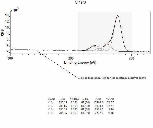 Data in a format suitable for import to Excel, Sigma Plot or Origin is output to an ASCII file using the Save TAB spaced ASCII file button. The resulting text file is created from those VAMAS blocks currently selected in the right-hand-side of the Experiment Frame, where separate tables are formatted from the data in each selected VAMAS block. The tables include the binding/kinetic energy, spectral intensities, background, each synthetic component in any peak model defined on the data and the total synthetic envelope. The table for each VAMAS block output includes columns using both counts-per-second and counts-per-bin.